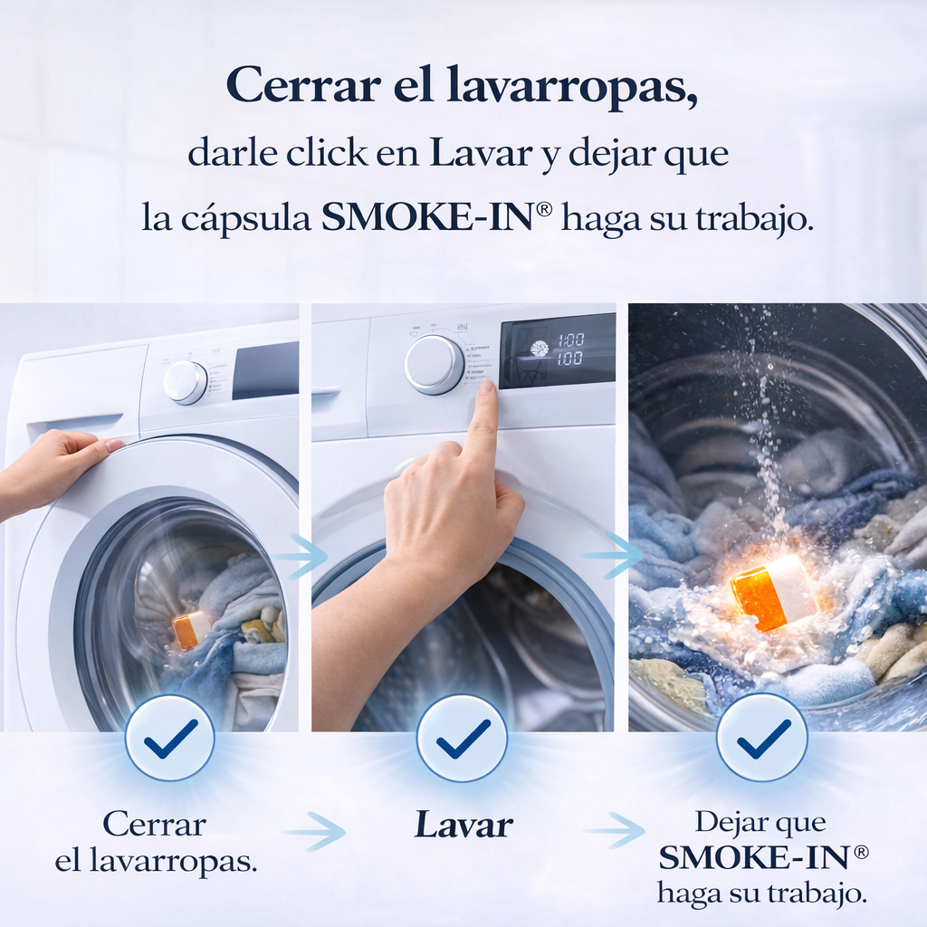 Tu tiempo vale oro. Simplificamos tu rutina de lavado con una solución "todo en uno". No necesitas pre-tratar, remojar ni mezclar ingredientes caseros. Solo tira la pastilla al tambor y deja que la tecnología efervescente de SMOKE-IN haga el trabajo sucio por vos en minutos.